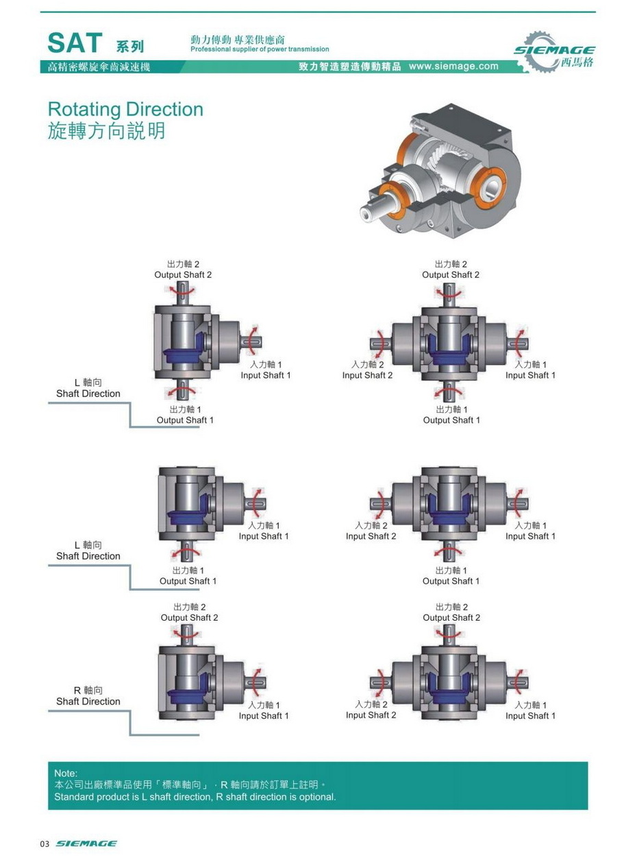 西马格螺旋伞齿轮减速形式有SAT-FO,SAT-FN,SAT-FM,SAT-FV,SAT-FP,SAT-RO,SAT-DO,SAT-YO,SAT-RN,SAT-RM,SAT-RS,SAT-RV,SAT-RP,SAT-DN,SAT-DM,SAT-DV,SAT-YS,SAT=YV等24种之种,满足各装安装需求。